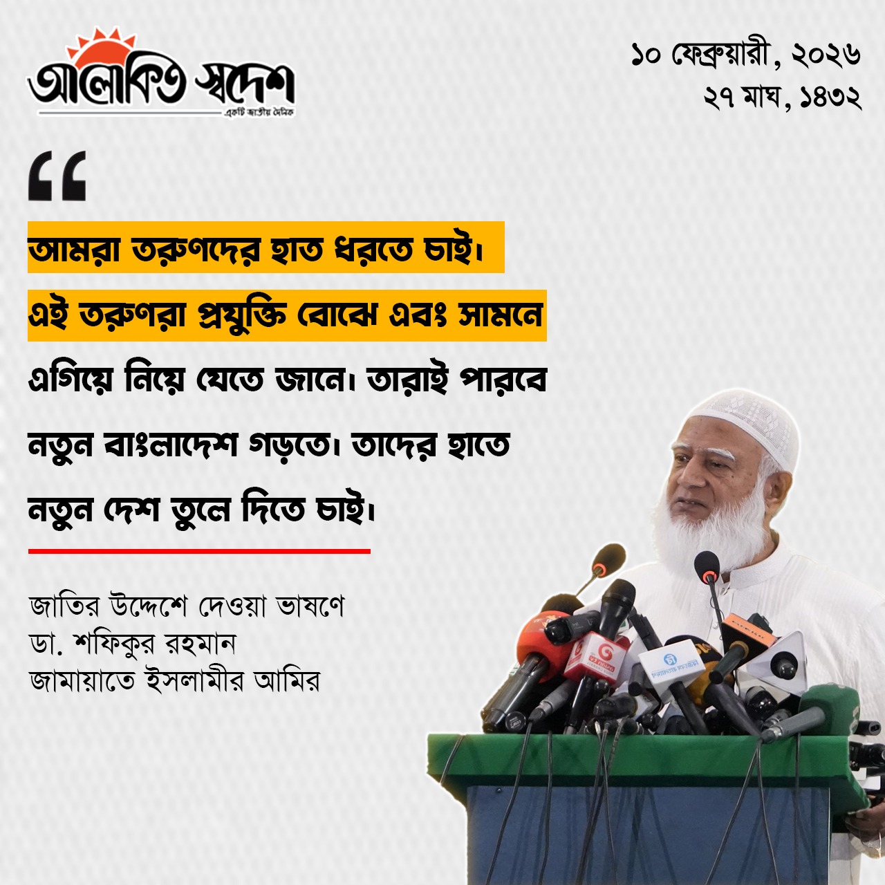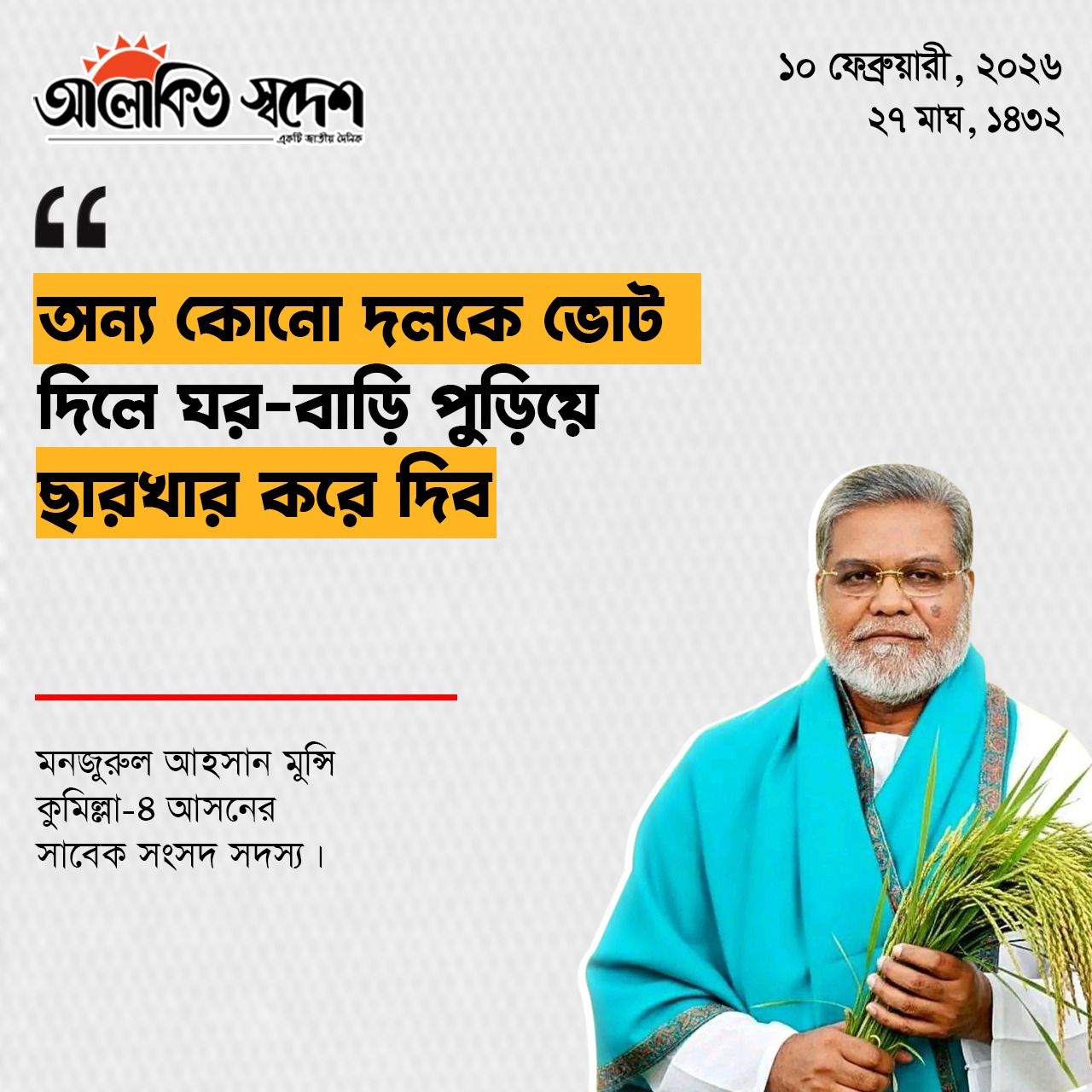 তিনি বলেন, এই বাস্তবতা উপলদ্ধি করে একটি নির্দিষ্ট দল ক্রমাগত অপপ্রচার ছড়াচ্ছে; সহিংস রাজনীতির ইঙ্গিত দিচ্ছে, ধর্মকে রাজনৈতিক স্বার্থে অপব্যবহার করে ভোট চাইছে, এমনকি জাল ভোটের প্রস্তুতিও দেখা যাচ্ছে। জনরায়ের শক্তির মুখে দাঁড়িয়ে এ ধরনের অপকৌশলই তাদের রাজনৈতিক দেউলিয়াত্বের প্রমাণ।