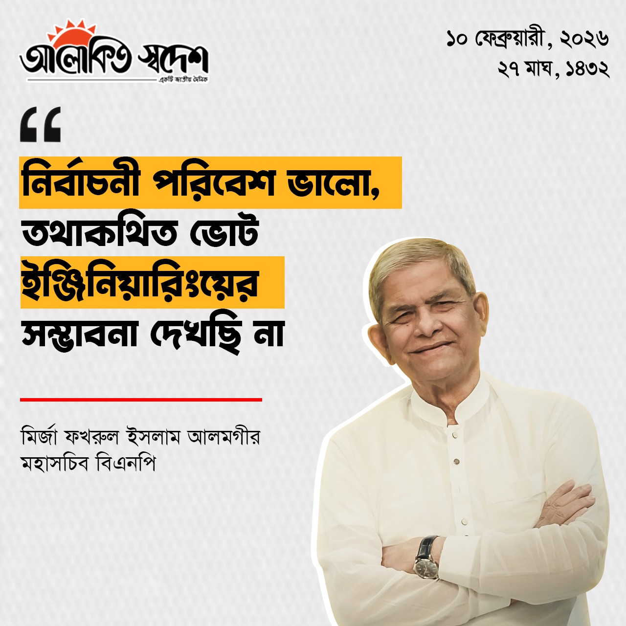 বিএনপির নির্বাচন পরিচালনা কমিটির মুখপাত্র বলেন, গত ২২ জানুয়ারি থেকে আজ সকাল সাড়ে ৭টা পর্যন্ত নির্বাচনি প্রচারণার নির্ধারিত সময় ছিল। উৎসবমুখর এই সময়ে দেশি ও আন্তর্জাতিক গণমাধ্যমের ধারাবাহিক প্রতিবেদন, বিভিন্ন নির্ভরযোগ্য প্রতিষ্ঠান ও জরিপের ফলাফল, বিএনপির চেয়ারম্যান তারেক রহমানের নির্বাচনি জনসভায় মানুষের স্বতঃস্ফূর্ত ও বিপুল উপস্থিতি এবং মাঠ পর্যায়ের বাস্তবতা মিলিয়ে স্পষ্ট হয়েছে, জনসমর্থনের দিক থেকে বিএনপি সর্বোচ্চ পর্যায়েই রয়েছে। সারা দেশে বিএনপির পক্ষে যে গণজোয়ার সৃষ্টি হয়েছে, তাতে একটি অবাধ, সুষ্ঠু ও গ্রহণযোগ্য নির্বাচন হলে বিএনপির নিরঙ্কুশ বিজয় অনিবার্য, ইনশাআল্লাহ।